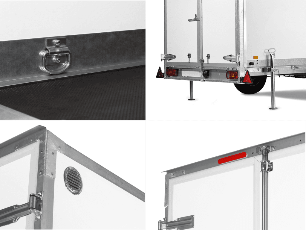 Remorque fourgon légère et étanche pensée pour les pros : caisse en panneaux nid d’abeille (Honeycomb) résistants aux chocs, portes arrière et ventilation anti-condensation pour garder votre matériel protégé au quotidien. Source